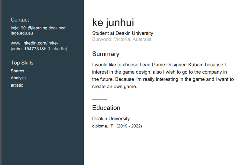 I would like to be a game designer after completing my degree because I really like playing games, I hope to create my own game in the future then I have to learn basic knowledge about IT. Playing the game is interesting. I’m good at social and artistic and I believe my skills will improve my job.